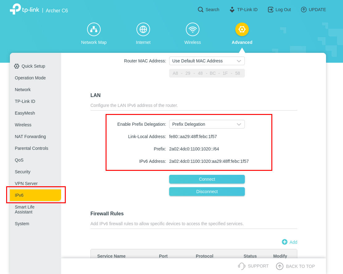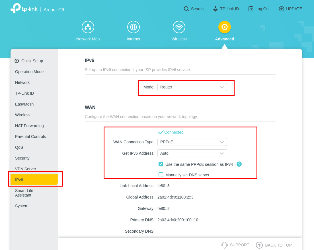 - Ако връзката е успешна, ще видите статус Connected и IPv6 адреси в секцията „Global Address“ и „Gateway“.